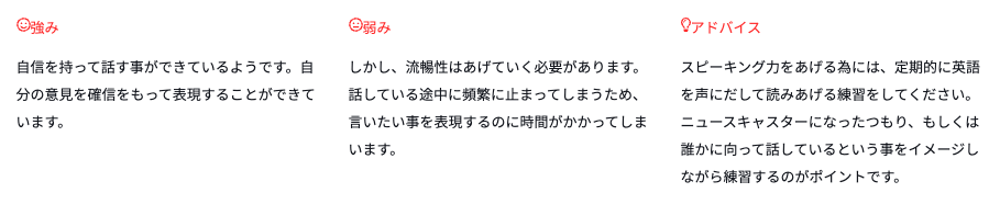 私が過去に体験レッスンを受けたときのフィードバックは以下でした。当時はTOEIC800点レベルで、BizmatesのレベルチェックはLevel2のAでした。(Levelは0~5まであります)