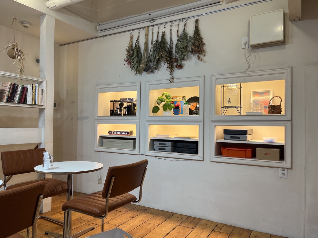 イートインスペースもお洒落で落ち着く空間。2名がけのテーブル3席とカウンター3席です。
