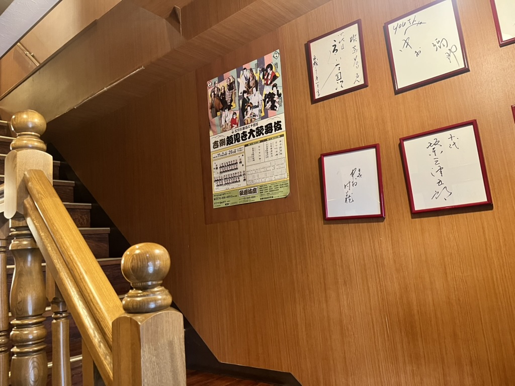 →この日は1階席でしたが、2階にも席があります。階段前には芸能人のサインが飾られています。