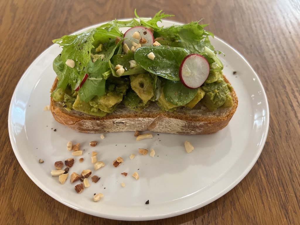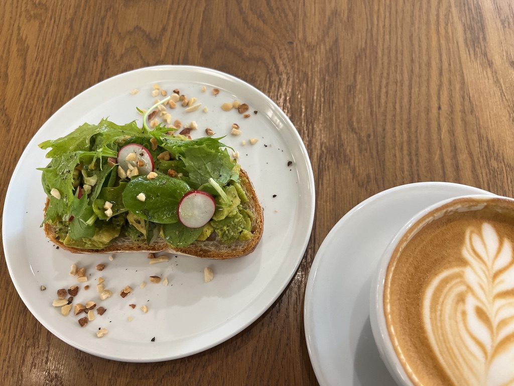カフェラテと一緒にいただいた「アボカドバジルのオープンサンド」は、ナッツの香ばしさがアクセントになっていて絶品でした。