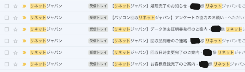 以下のような感じで登録から回収品到着、データ消去完了までの進捗がメールで来るので、安心ですよ。